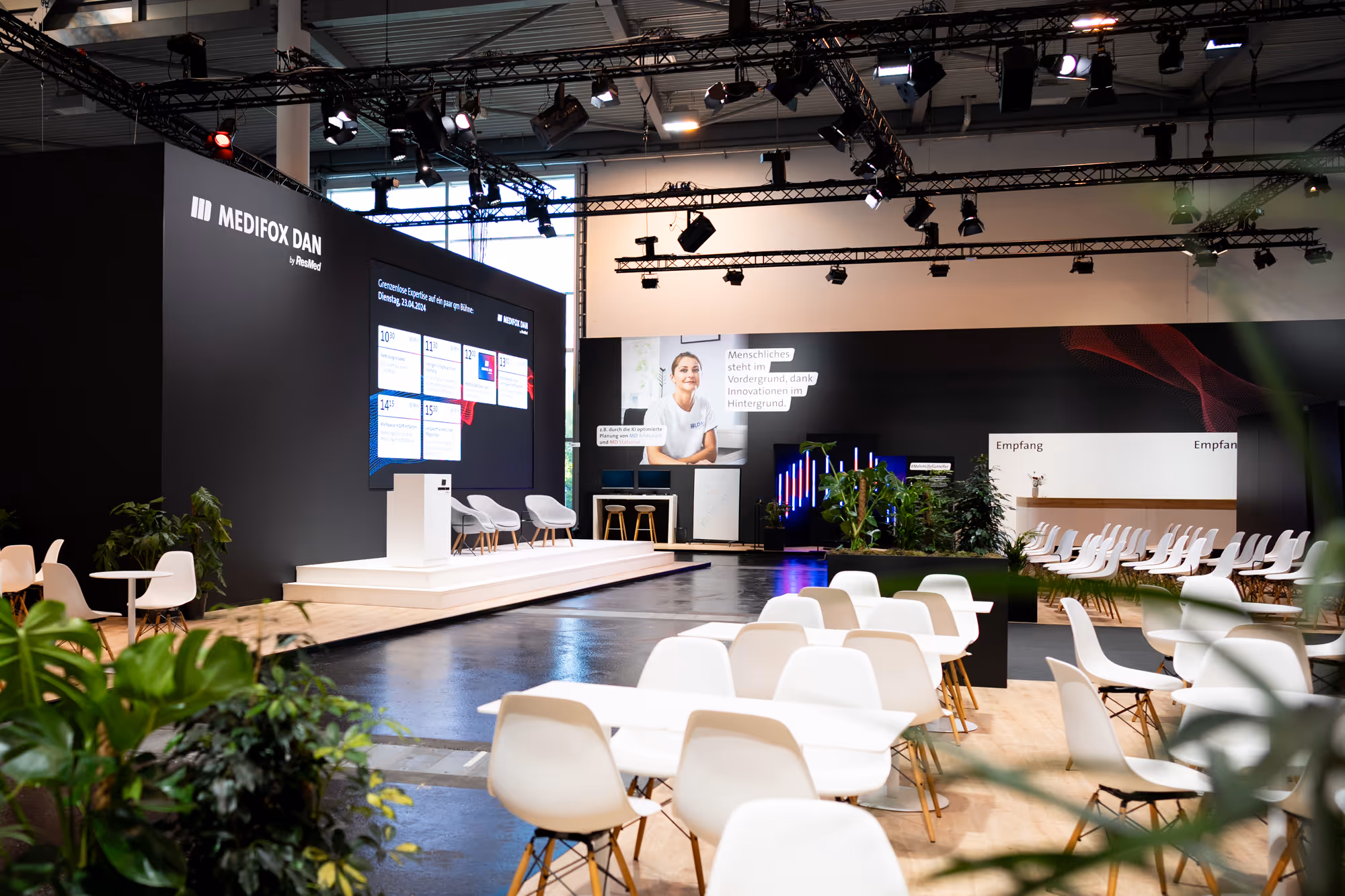 Auf 600 Quadratmetern und mit über 120 Mitarbeitenden: so präsentiert sich der Branchenführer MEDIFOX DAN im Bereich Software-Lösung auf der Altenpflege Messe 2024 in Essen. Im Fokus standen dabei die Kund*innen, welche sich an den Beratungsinseln, in den Lounges oder im MEDIFOX DAN Café umfangreich über die Produkte, Neuheiten und Weiterbildungen beraten lassen konnten. Neben MEDIFOX DAN, und gestalterisch in das Gesamtkonzept integriert, präsentierten sich unter anderem smartAware und weitere Gruppenfirmen.